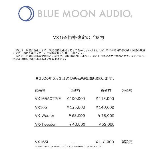 BLUE MOON AUDIO VX165 価格改定 5月1日より販売価格変更のお知らせ 2026年04月08日(水) NEW BLUE MOON AUDIO VX165 価格改定 BLUE MOON AUDIO VX165 が価格改定致します。 値上げ前に購入したい方はお早めにご連絡お願いします。 ●2026年5月1日より新価格を適用致します。以下の通りです。 商品名 旧価格 新価格 (税別) VX165ACTIVE ¥100,000 ¥115,000 VX165 ¥125,000 ¥140,000 VX-Woofer ¥68,000 ¥78,000 VX-Tweeter ¥48,000 ¥55,000 VX165L - ¥118,000 新設定